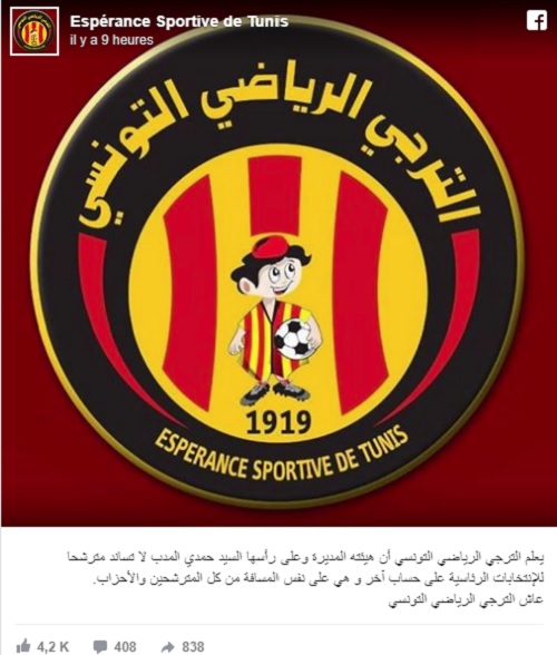 Tunisie-Tribune (Présidentielles 2019 & l’Espérance Sportive de Tunis) – allant bon train, les rumeurs ne ratent personne et encore moins les grands clubs. Pour l’élection présidentielle anticipée de ce dimanche 15 septembre 2019, certaines indiscrétions ont affirmé que l’Espérance Sportive de Tunis (EST) aurait apporté son soutien à un candidat en particulier. Le Club de bab Souika vient de démentir catégoriquement via un communiqué cette rumeur largement partagée sur les réseaux sociaux.