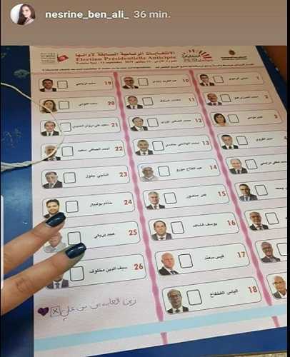 La fille de l’ancien président a écrit le nom de son père à la main sur son bulletin de vote pour montrer que c’était pour lui qu’elle avait voté. Elle a, par la suite, publié la photo sur Instagram. Elle a juste oublié un détail et non des moindres : publier une photo de son bulletin de vote sur les réseaux sociaux est passible d’une amende de 2000 TND et d’un an de prison.