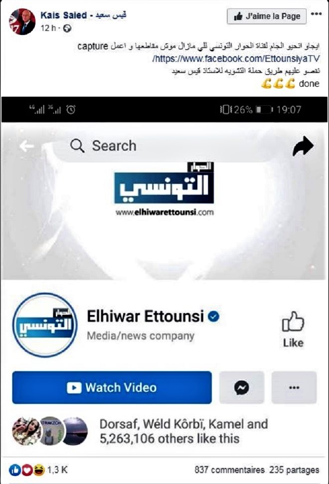 Tunisie-Tribune (boycot d’Al-Hiwar Ettounsi) – La page Facebook officielle de la chaîne privée Al Hiwar Ettounsi vient de perdre environ un million d’abonnés et ce, au bout de quelques heures. La raison, serait d’ « l’attaque » et la campagne de dénigrement menées par ses chroniqueurs et animateurs dans la soirée du mardi 17 septembre 2019 à l’encontre du candidat à l’élection présidentielle anticipée Kais Said dont le passage au deuxième tour vient de se confirmer par l’Instance Supérieure Indépendante pour les élections ISIE.