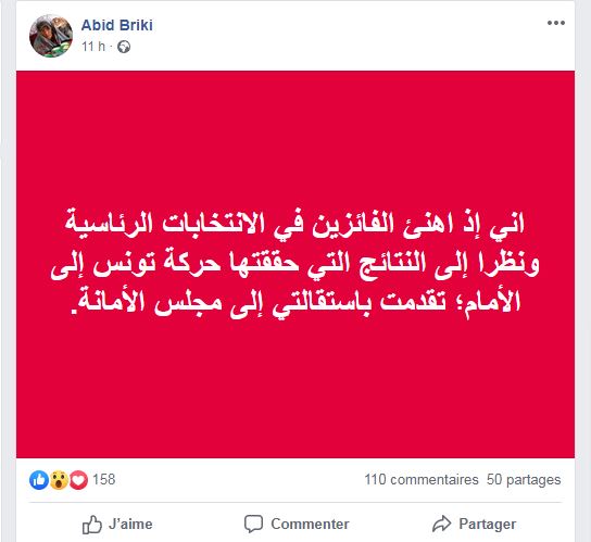 Tunisie-Tribune (Abid Briki) – Dans un post publié sur sa page officielle Facebook dans la soirée du mercredi 18 septembre 2019, le candidat à l’élection présidentielle anticipée du 15 septembre dernier et ancien ministre de la Fonction publique, de la Gouvernance et et de la Lutte contre la corruption dans le gouvernement Chahed, Abid Briki a exprimé ses félicitations et vœux de réussite aux deux candidats du deuxième tour de la présidentielle. Il a par ailleurs, annoncé sa démission du poste de secrétaire général au sein du mouvement «Tunisie en avant» expliquant ce retrait par les résultats décevants.