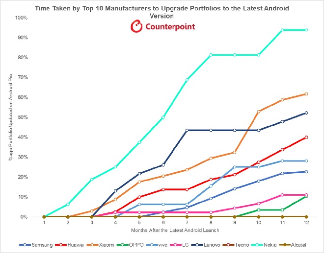 Tarun Pathak, directeur associé chez Counterpoint Technology Market Research, n’a pas manqué de commenter les performances réalisées par les différentes marques de smartphones: «Parmi les 10 plus grands fabricants de smartphones, près de 96% des smartphones Nokia, vendus cumulativement depuis le troisième trimestre 2018, fonctionnent déjà sous Android Pie ou ont été mis à jour de manière à fonctionner sous Android Pie. Samsung suit de près avec 89%, tandis que Xiaomi lui emboîte le pas avec 84%. Il convient de signaler que Xiaomi a réussi à assurer le lancement, à un prix accessible, de ses produits tout en les équipant de la toute dernière version d’Android».