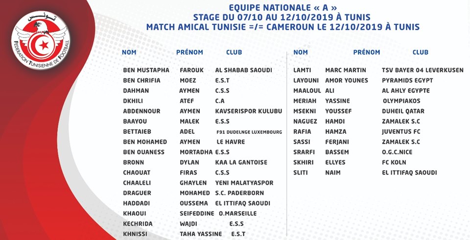 Tunisie-Tribune (Tunisie-Cameroun) – Le sélectionneur national, Mondher Kebaier, a convoqué 28 joueurs pour le prochain match des «Aigles de Carthage», prévu face au Cameroun en amical. Comme prévu, Aymen Abdennour signe son retour en sélection après une assez longue absence. Rappelons que la rencontre aura lieu le 12 octobre au stade de Rades.