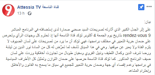 Tunisie-Tribune (Attessia) – La chaîne privée Attessia a publié, ce vendredi 4 octobre 2019, sur sa page officielle un communiqué à travers lequel elle a tenu à clarifier que les déclarations des invités n’exprimaient pas sa position, et ce suite à la polémique suscitée par les déclarations de Sahbi Smara, à propos de certaines personnalités politique, lors de son passage à l’émission “Rendez-vous 9”.
