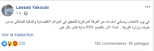 Tunisie-Tribune (plainte contre Lassaad Yaakoubi) – Le secrétaire général de la Fédération générale de l’enseignement secondaire Lassâad Yaâcoubi a publié sur sa page facebook un statut dans lequel il déclare avoir été convoqué par l’unité centrale d’enquête sur les crimes économiques et financiers, suite à une plainte du ministère de l’Education nationale.