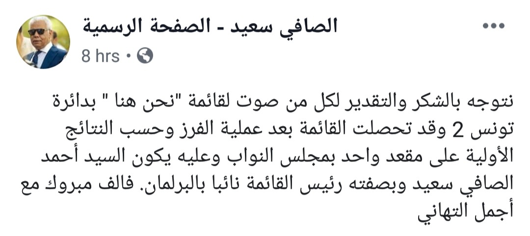 Tunisie-Tribune (Safi Saïd) – Safi Saïd, tête de la liste « Na7nou Houna » de la circonscription de Tunis 2, a publié un message sur sa page officielle affirmant qu’il vient d’être élu député selon les résultats préliminaires.