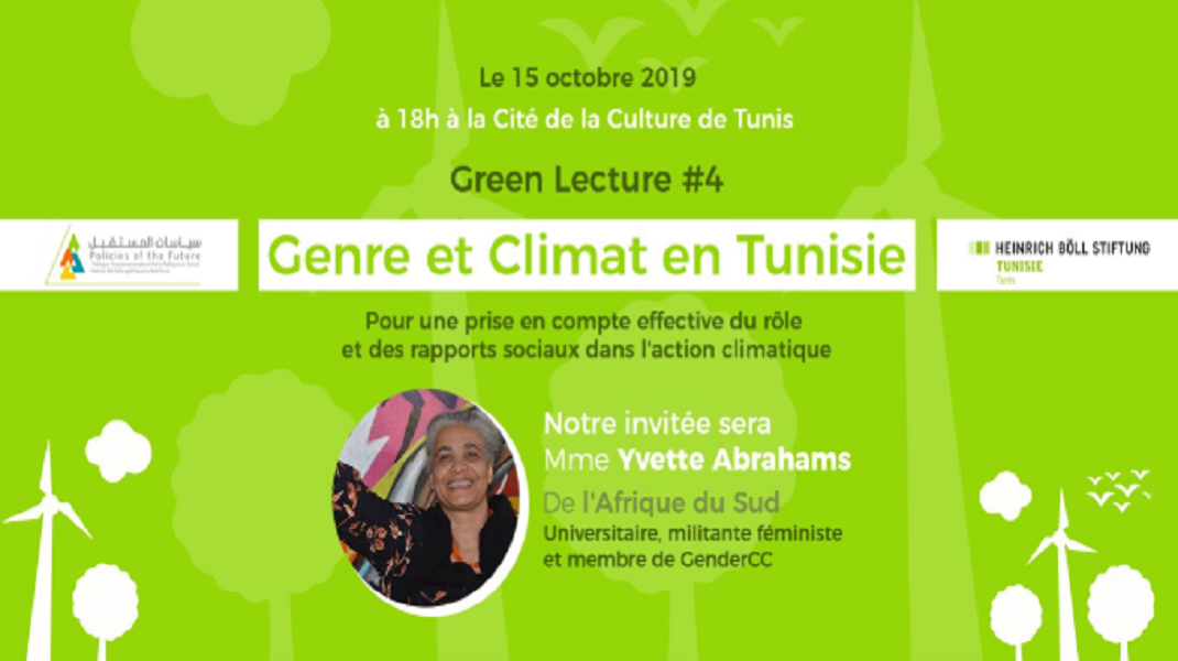 Organisé sous le thème : « Genre et climat en Tunisie ! Pour une prise en compte effective du rôle et des rapports sociaux dans l’action climatique », Green Lecture #4 se tiendra  donc le mardi 15 octobre 2019 à partir de 18h00, à la Cité de la culture de Tunis, avec pour invitée d’honneur, Mme Yvette Abrahams (Afrique du Sud),  professeur à l’Université du Cap et à l’Université de Western Cape, militante féministe et membre de Gender and Climate Change, réseau mondial d’organisations, d’experts et de militantes œuvrant pour l’égalité des sexes, les droits des femmes et la justice climatique.