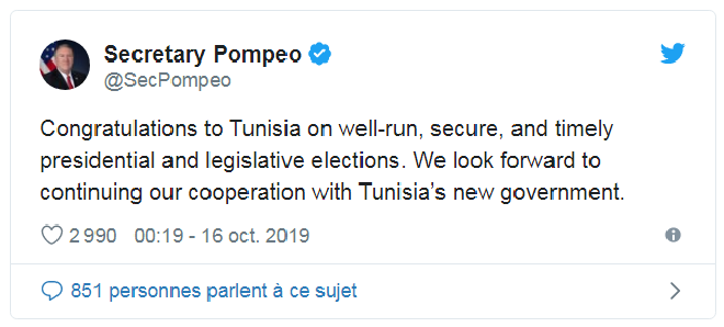 Tunisie-Tribune (Mike Pompeo) – Le ministre américain des Affaires étrangères, Mike Pompeo, a félicité le peuple tunisien à l’issue du bon déroulement des Législatives et de la Présidentielle et a exprimé son intention de coopérer avec le nouveau gouvernement.
