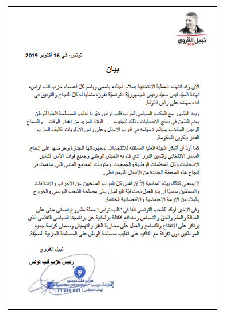 Tunisie-Tribune (Présidentielles 2019) – Dans un communiqué rendu public, le parti politique de Nabil Karoui, Qalb Tounes, le compte pas contester des résultats de l’élection présidentielle.