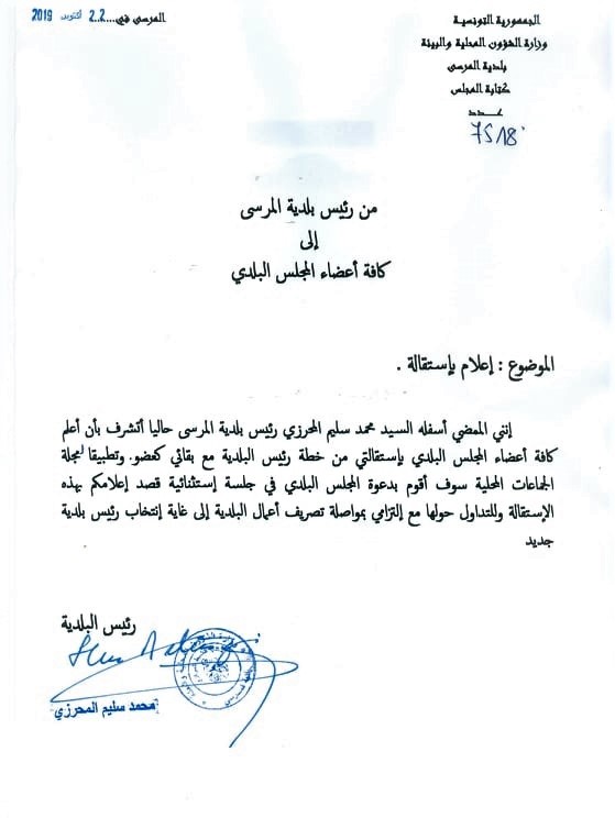 Tunisie-Tribune (Mohamed Slim Meherzi) – Le président du conseil municipal de la Marsa, Mohamed Slim Meharzi, a présenté sa démission de la présidence de la municipalité mais il restera en tant que membre. Aucune raison n’a encore été annoncée officiellement, nous y reviendrons.