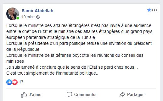 Tunisie-Tribune (Carthage) – Dans un post publié sur sa page officielle Facebook ce mardi 29 octobre 2019, l’ancien ambassadeur de Tunisie au Liban et membre de la campagne électorale du candidat à la Présidentielle Youssef Chahed, Samir Abdellah a dénoncé certaines pratiques de hauts cadres de l’Etat considérant que ces cafouillages relèvent de l’immaturité politique de nos dirigeants.