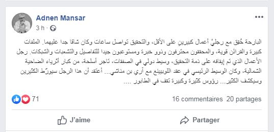 Notons que dans un post publié sur sa page officielle Facebook, l’ex dirigeant au sein du mouvement Harak Tounes Al Irada, Adnen Mansar a affirmé que deux hommes d’affaires dont le médiateur dans l’affaire du lobbying, ont fait l’objet d’un interrogatoire policier pendant des heures dans la soirée précédente.