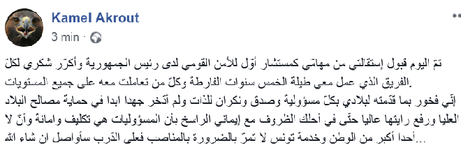 Tunisie-Tribune (l’amiral Kamel Akrout) – L’amiral Kamel Akrout, premier conseiller du président chargé de la sécurité nationale, a annoncé sur sa page facebook que sa démission a été acceptée.