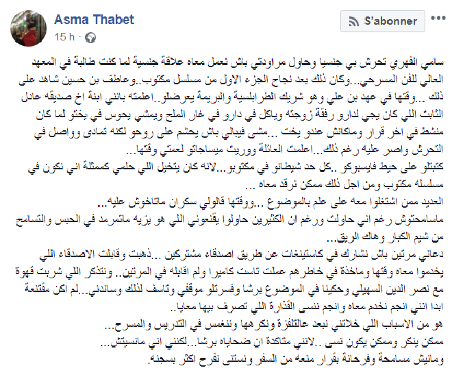 En effet, dans une publication sur son compte Facebook, Asma Thabet a affirmé que Sami Fehri l’avait harcelé alors qu’elle était étudiante à l’Institut Supérieur d’Art Dramatique (ISAD).