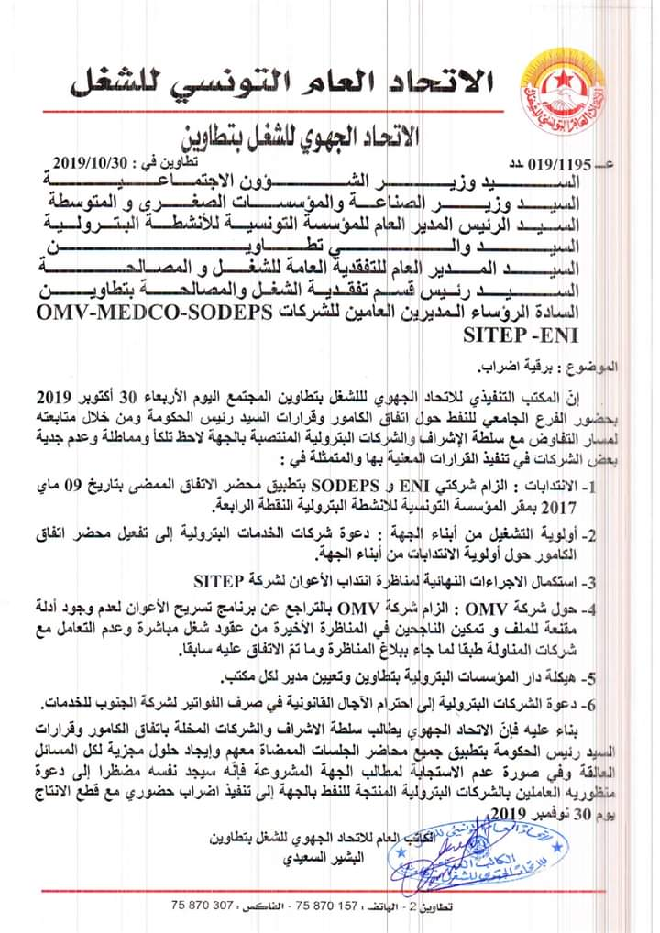 Tunisie-Tribune (L’UGTT menace de grève) – L’Union régionale du Travail de Tatatouine menace de grève dans le secteur pétrolier le 30 novembre 2019 et de suspendre la production en cas de respect de l’accord Al Kamour et non application des décisions de la présidence du gouvernement concernant les recrutement dans les sociétés de ENI et SODAPES.