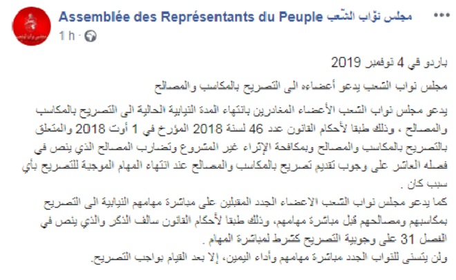 Tunisie-Tribune (députés) – L’Assemblée des représentants du peuple a appelé les députés sortants et les nouveaux élus à déclarer leur patrimoine conformément à la loi 46 de 2018 relative à la déclaration des biens et des intérêts, de la lutte contre l’enrichissement illicite et le conflit d’intérêt dans le secteur public.