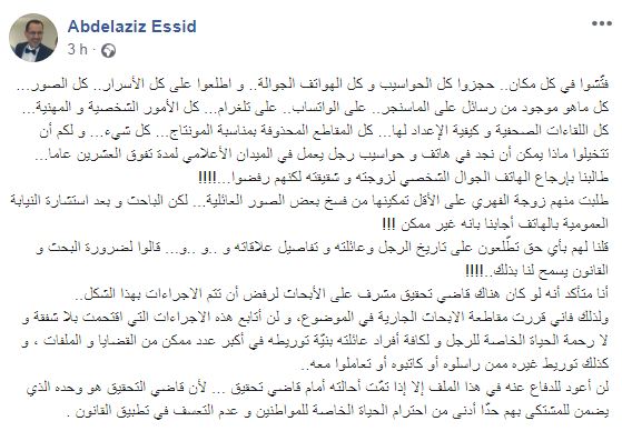 « Ils ont effectué une descente dans son domicile sans aucune pitié et ont violé la vie privée des membres de sa famille afin de l’impliquer dans un maximum d’affaires et de dossiers. Pareil pour toutes les personnes qui étaient en relation avec lui. » continuant « Je ne défendrai plus ce dossier à moins qu’il soit transféré à un juge d’instruction car il le seul à garantir à un seuil minimum de respect pour la vie privée des citoyens loin des abus ».