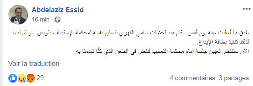 Tunisie-Tribune (Sami Fehri) – Abdelaziz Essid, avocat de Sami Fehri vient de publier un statut Facebook pour annoncer que son client s’est rendu aux autorités à la Cour d’appel de Tunis, conformément au mandat de dépôt émis à son encontre.