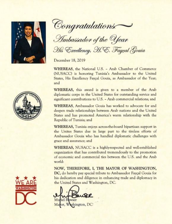 Tunisie-Tribune (Fayçal Gouiaa) – L’ambassadeur de Tunisie aux Etats-Unis Fayçal Gouiaa a été désigné ambassadeur de l’année 2019, par la Chambre de commerce nationale américano-arabe (NUSACC), pour sa contribution aux relations commerciales américano-arabes.