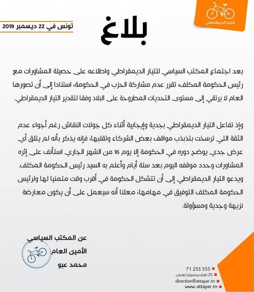 Tunisie-Tribune (gouvernement) – Le Courant démocrate a annoncé dans un communiqué rendu public ce dimanche 22 décembre qu’il a décidé au terme de la réunion de son bureau politique de ne pas participer au prochain gouvernement.