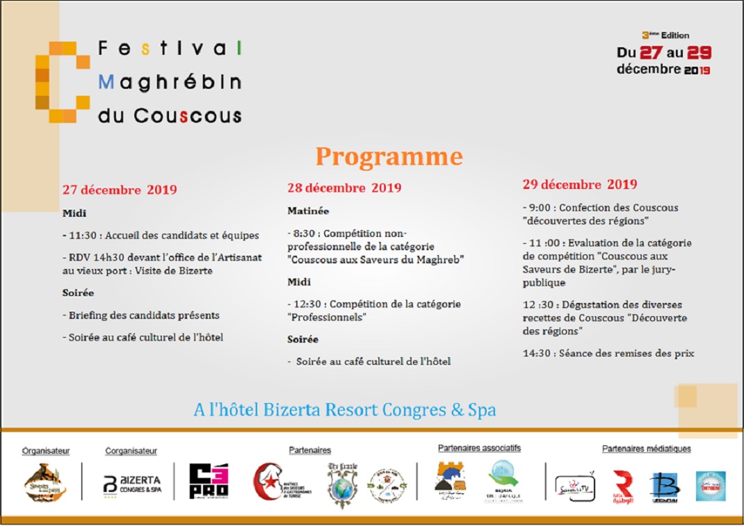 Tunisie-Tribune (festival maghrébin du couscous) – la troisième édition du festival maghrébin du couscous co-organisé par l’association saveurs de mon pays et l’hôtel Bizerta resort du 27 au 29 Décembre 2019.