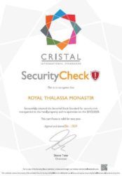 Le Cristal Security Check atteste que le Royal Thalassa Monastir a mis en œuvre tous les protocoles, systèmes et arrangements exigés par Cristal International Standards concernant tous les aspects de la sécurité de l’établissement, y compris la télésurveillance, le contrôle d’accès des clients, des fournisseurs et du personnel, la communication sécurisée, le recrutement du personnel, la sécurité de l’information, le traitement du courrier, la planification de l’évacuation et la prévention face à diverses menaces pouvant mettre en danger la sécurité de l’hôtel, telles que véhicules extérieurs, produits chimiques ou biologiques, armes à feu…