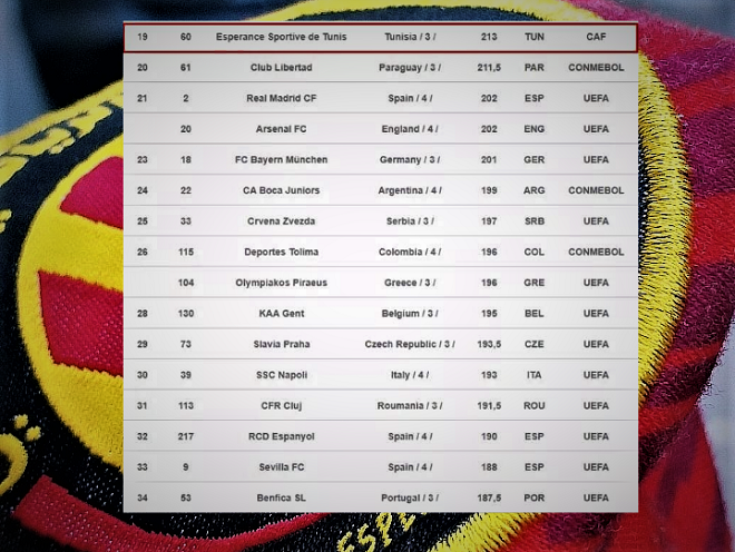 Tunisie-Tribune (Espérance Sportive de Tunis) – L’Institut International des Statistiques de Football (IFFHS) a publié, ce mardi 21 janvier 2020, le classement mondial des clubs. L’Espérance Sportive de Tunis se retrouve dans le TOP 20.