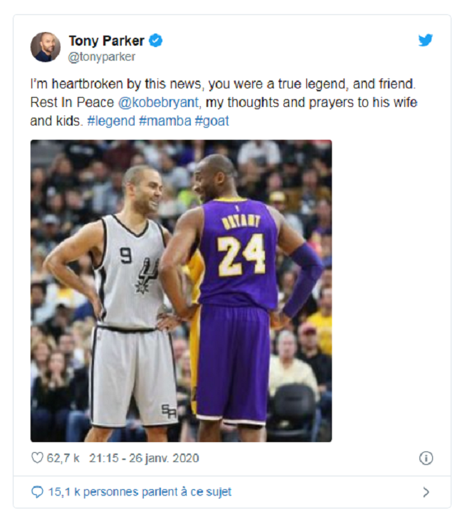 Le baksetteur français Tony Parker a été le premier à réagir. Celui qui l’a affronté avec San Antonio pendant une quinzaine d’années, notamment au cours de haletantes séries de play-offs à l’Ouest s’est dit « le cœur brisé ». « Tu étais une vraie légende et un ami. Repose en paix Kobe Bryant, mes pensées et mes prières vont vers sa femme et ses enfants #légende #mamba #goat », a-t-il réagi sur Twitter.