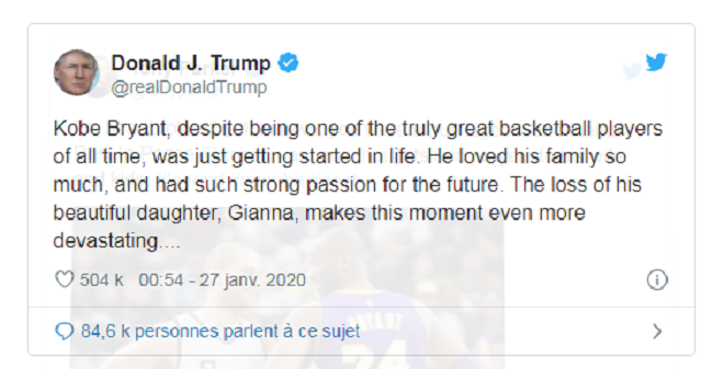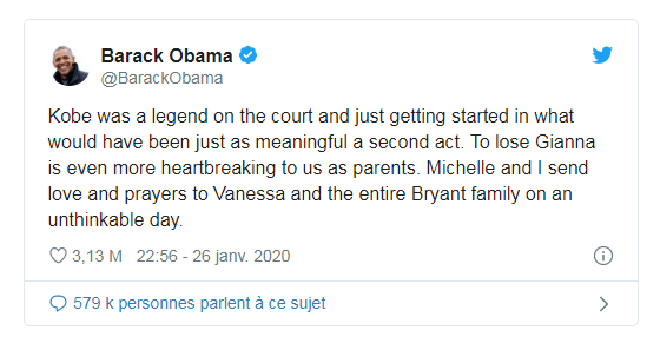 L’ancien locataire de la Maison Blanche Barack Obama, grand amateur de basket, lui a rendu un hommage appuyé : « Kobe était une légende sur les parquets et commençait à l’être dans ce qui aurait été un second acte tout aussi fort ».