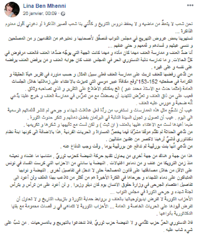 La blogueuse a écrit qu’Ennahdha n’est pas un parti révolutionnaire et fait partie de ceux qui ont favorisé la corruption en Tunisie, tandis que le PDL (Parti Destourien Libre) n’est pas un parti progressiste et que son cinéma ne doit trompr personne: