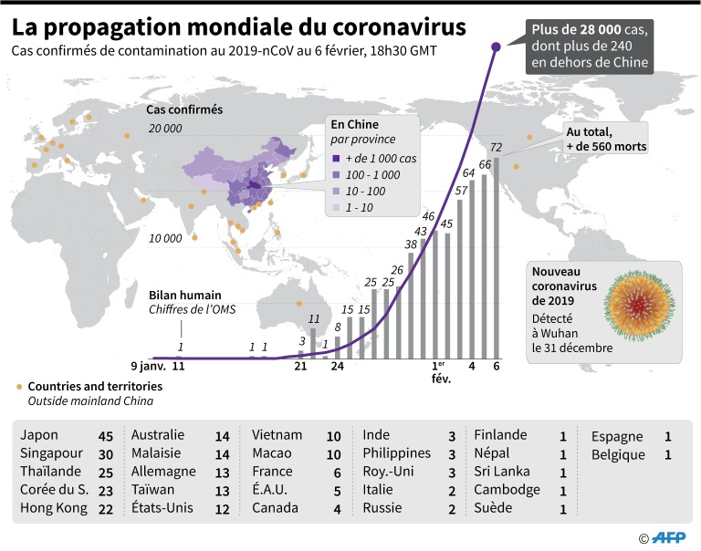 Dans le reste du monde, 240 cas de contaminations ont été confirmés dans une trentaine de pays et territoires, dont deux mortels, à Hong Kong et aux Philippines. Des centaines de touristes à bord de trois paquebots sont bloqués en Asie par l’apparition du virus à bord.