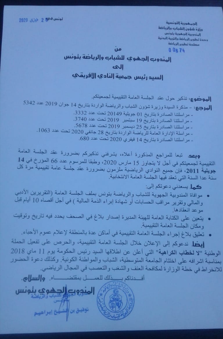 Tunisie-Tribune (Club Africain) – Le commissariat régional du sport a appelé dans une correspondance envoyée au Club Africain le 25 février 2020, le club de Bab Jedid à organiser son assemblée générale évaluative dans un délai ne dépassant pas le 15 mars.