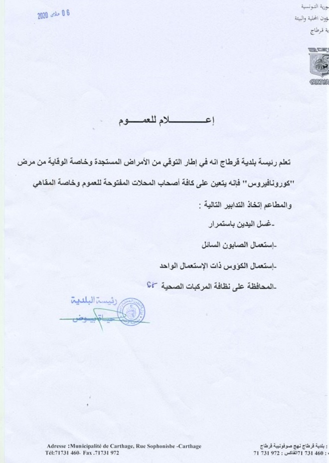 Tunisie-Tribune (commune de la Marsa) – via un communiqué officiel, La commune de la Marsa Carthage appelle les propriétaires des salons de thé à prendre les mesures suivantes :