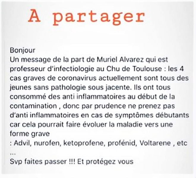 Les anti-inflammatoires qu’ils soient non stéroïdiens ou à base de corticoïdes sont donc déconseillés en cette période de pandémie. Les patients habitués à les prendre pour n’importe quelle raison, doivent prendre l’avis de leur médecin.