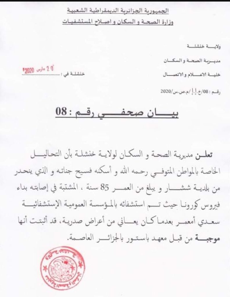 Et une fois n’est pas coutume, ce n’est pas le ministère de la Santé qui a annoncé ce nouveau décès. C’est la direction de la santé et de la population de la wilaya de Khenchela qui a pris la louable initiative de mettre en garde l’opinion publique en annonçant ce cas de COVID-19 et en fournissant des précisions qui en disent encore long sur les défaillances du dispositif sanitaire déployé par le ministère de la santé pour limiter la propagation du coronavirus en Algérie.