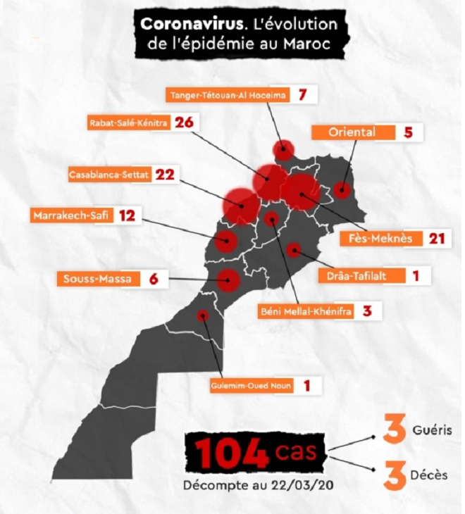 Tunisie-Tribune (Le Coronavirus au Maroc) – 8 nouveaux cas ont été enregistrés au Maroc, ce dimanche 22 mars. Le bilan total de personnes infectées par le virus s’élève désormais à 104 patients.