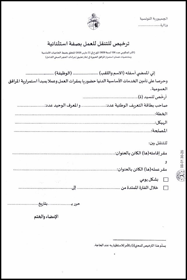 Tunisie-Tribune (Formulaire nécessaire) – Un formulaire à remplir a été mis en place par le gouvernement pour permettre aux personnes qui doivent se déplacer pour accomplir leur travail de pouvoir le faire dans ce contexte de confinement général et de couvre-feu.