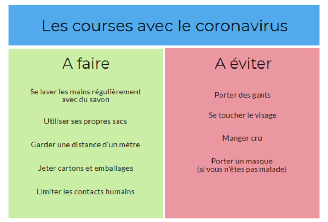 Concernant les chariots de courses, la Santé publique indique qu’ils peuvent, comme toutes les surfaces « servir de support au virus s’ils sont souillés par des gouttelettes respiratoires d’un sujet contaminé. Le virus peut rester quelques heures sur une surface comme un caddy, mais en quantité faible. En appliquant les mesures barrières (se laver les mains notamment) et en nettoyant le caddy avec une lingette, le risque devient négligeable. »