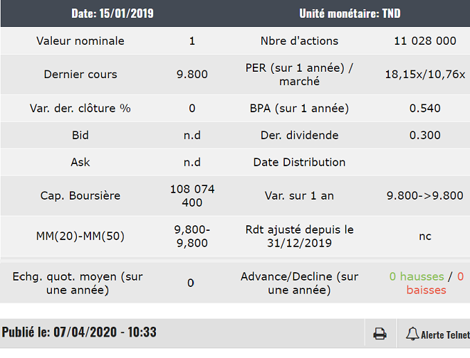 Au 31 mars 2020, l’EBITDA du Groupe TELNET HOLDING s’élève à 1 751 075 dinars contre 2 053 873 dinars au 31 mars 2019..
