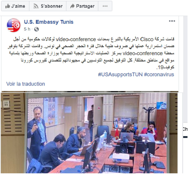Tunisie-Tribune (Vidéo conférence) – L’ambassade des Etats-Unis à Tunis a annoncé via sa page officielle sur Facebook que l’entreprise américaine Cisco Systems a offert des équipements de vidéoconférence au ministère tunisien de la santé pour assurer le bon déroulement de son travail pendant cette période de confinement.
