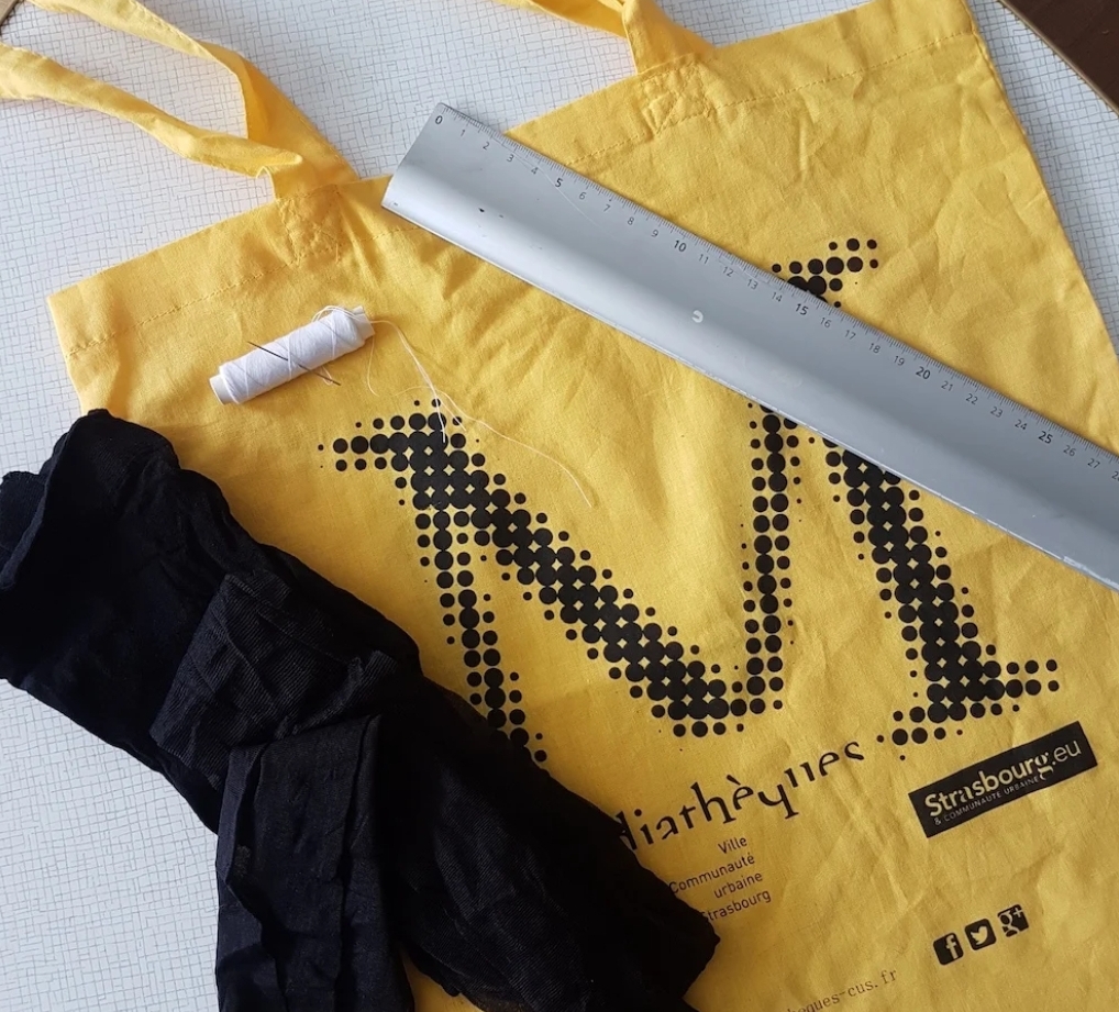 Pour réaliser ce tuto, il vous faudra du fil et une aiguille, une règle, un stylo, un tissu et de vieux collants.