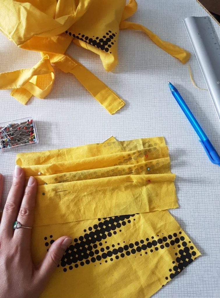 3. Realisez les plis. Marquez les plis avec des épingles (si vous n’en avez pas, vous pouvez marquer les plis avec un fer à repasser ou utiliser des trombones). Ici, nous sommes partis sur 3 plis, vous pouvez en faire seulement deux, comme sur le patron de l’Afnor.