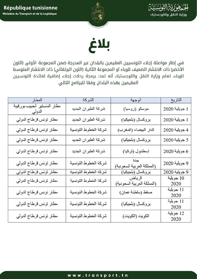 Tunisie-Tribune (vols d’évacuation supplémentaires) – Le ministère du Transport et de la logistique a annoncé ce mardi 30 juin 2020 que des vols d’évacuation supplémentaires seront organisés pour les tunisiens qui résident dans les pays du groupe de pays à faible prévalence épidémique (couleur verte) et du deuxième groupe de pays à propagation épidémique moyenne (couleur oranger).