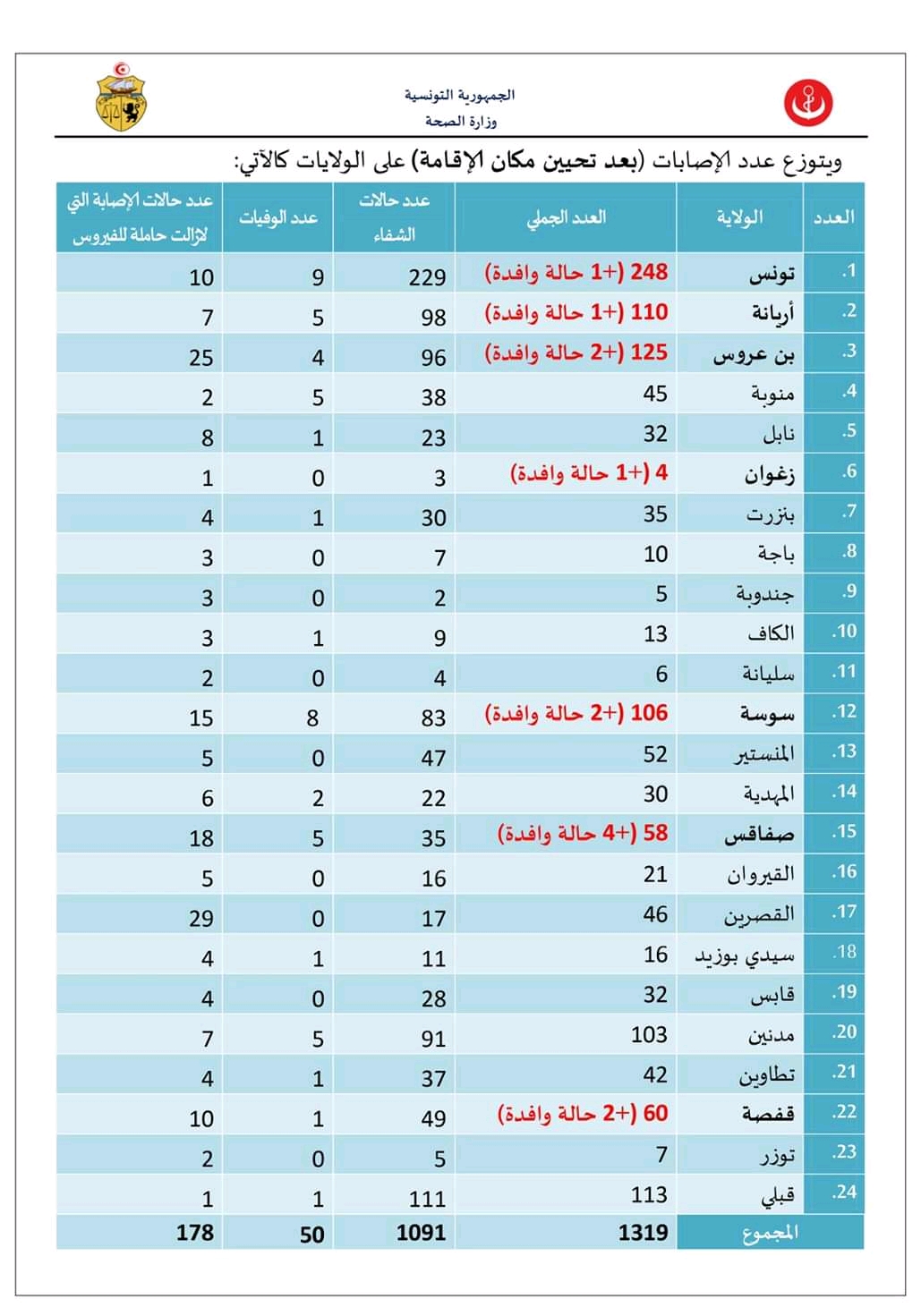 Tunisie-Tribune (Bilan du Covid-19 en Tunisie) – Le ministère de la santé a annoncé que le nombre des cas confirmés de coronavirus est passé à 1319 après la découverte de 13 cas importés de Covid-19 le 14 juillet 2020.