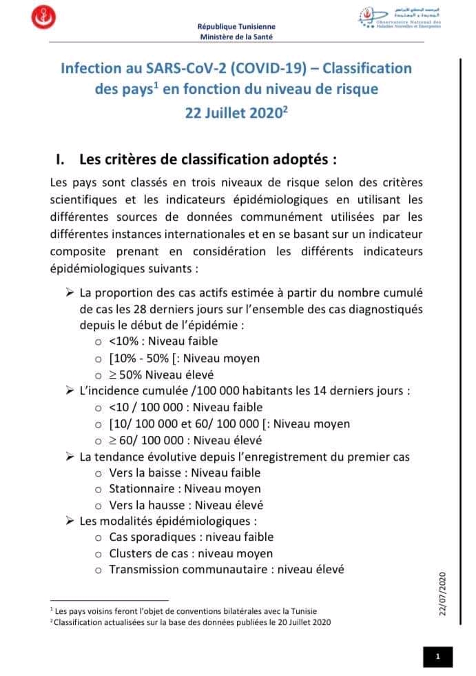 Tunisie-Tribune (Nouveau classement des pays) – Le ministère de la Santé a publié, ce jeudi 23 juillet 2020, le nouveau classement des pays en fonction du niveau de risque lié au Covid-19. Un classement effectué selon des critères scientifiques, selon le département, relatifs à un ensemble de facteurs épidémiologiques.