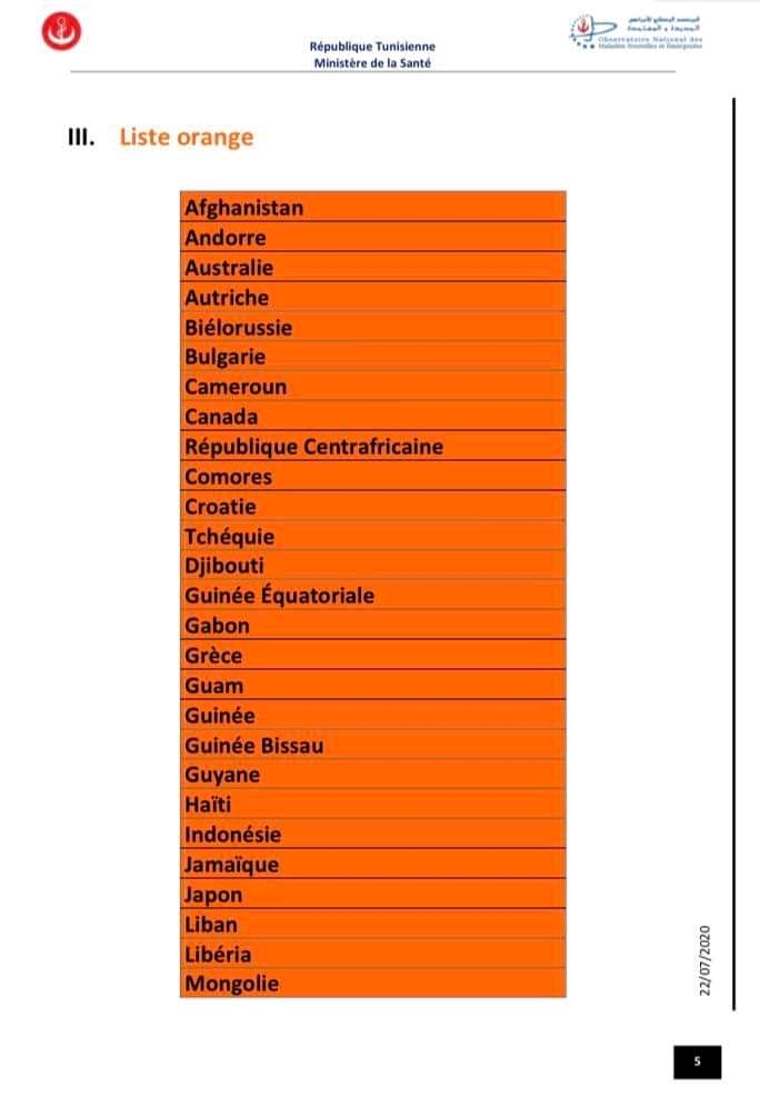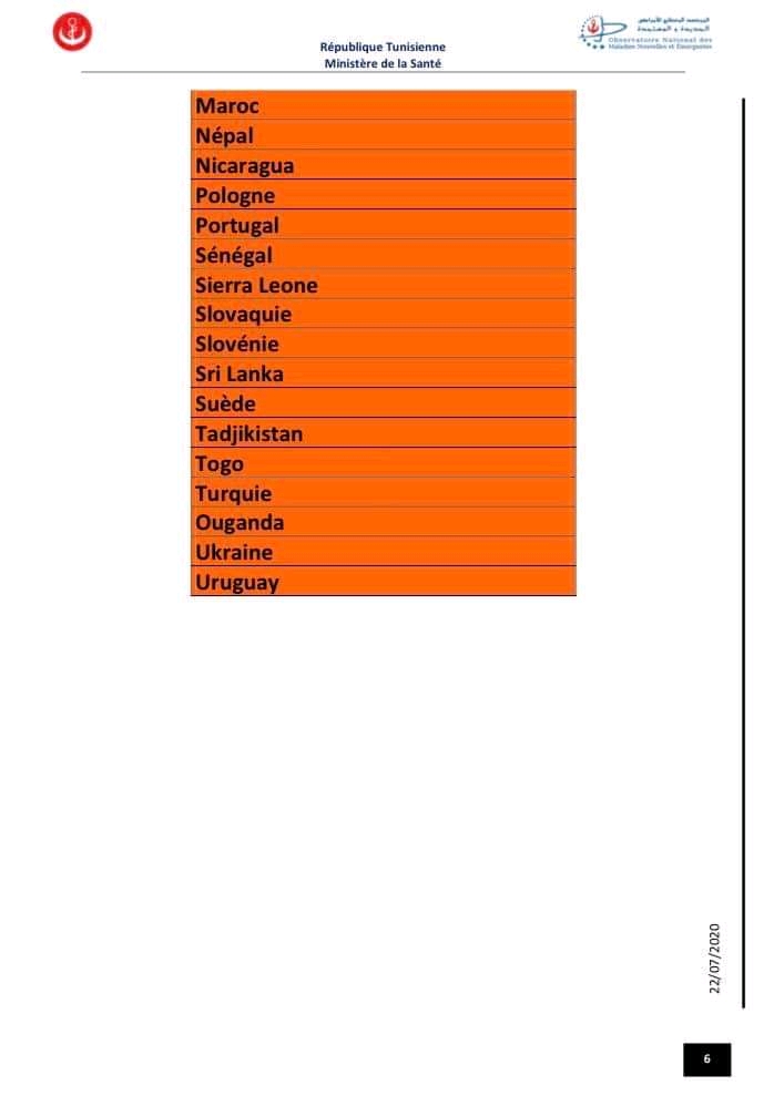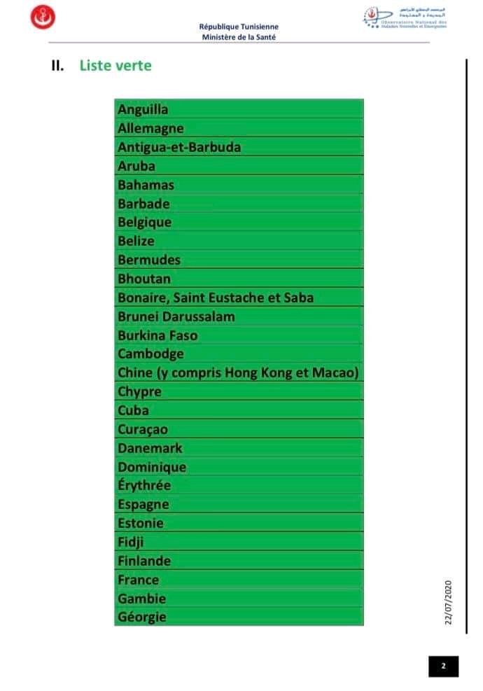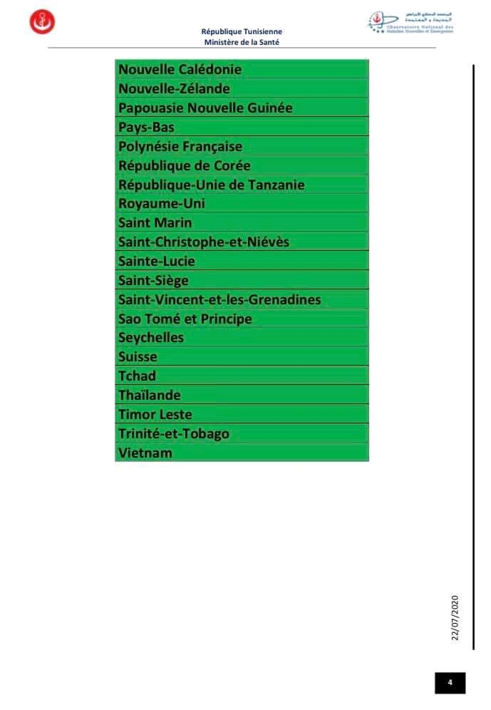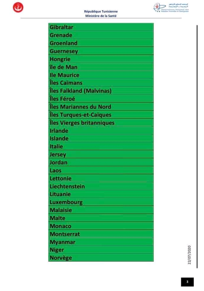 Cette liste est actualisée, au fur et à mesure, après la réouverture des frontières terrestres, maritimes et aériennes ayant eu lieu le 27 juin 2020. Notons qu’un pays classé vert signifie que le confinement n’est pas imposé aux passagers qui en proviennent et qu’aucun test PCR négatif n’est requis. Signalons que, selon le ministère de la Santé, l’Etat n’était plus en mesure de couvrir les frais du confinement des citoyens tunisiens et que désormais, l’auto-isolement pour les rapatriés a été fixé à quatorze jours. Ils feront, tout de même, l’objet d’un suivi médical de la part des autorités sanitaires.