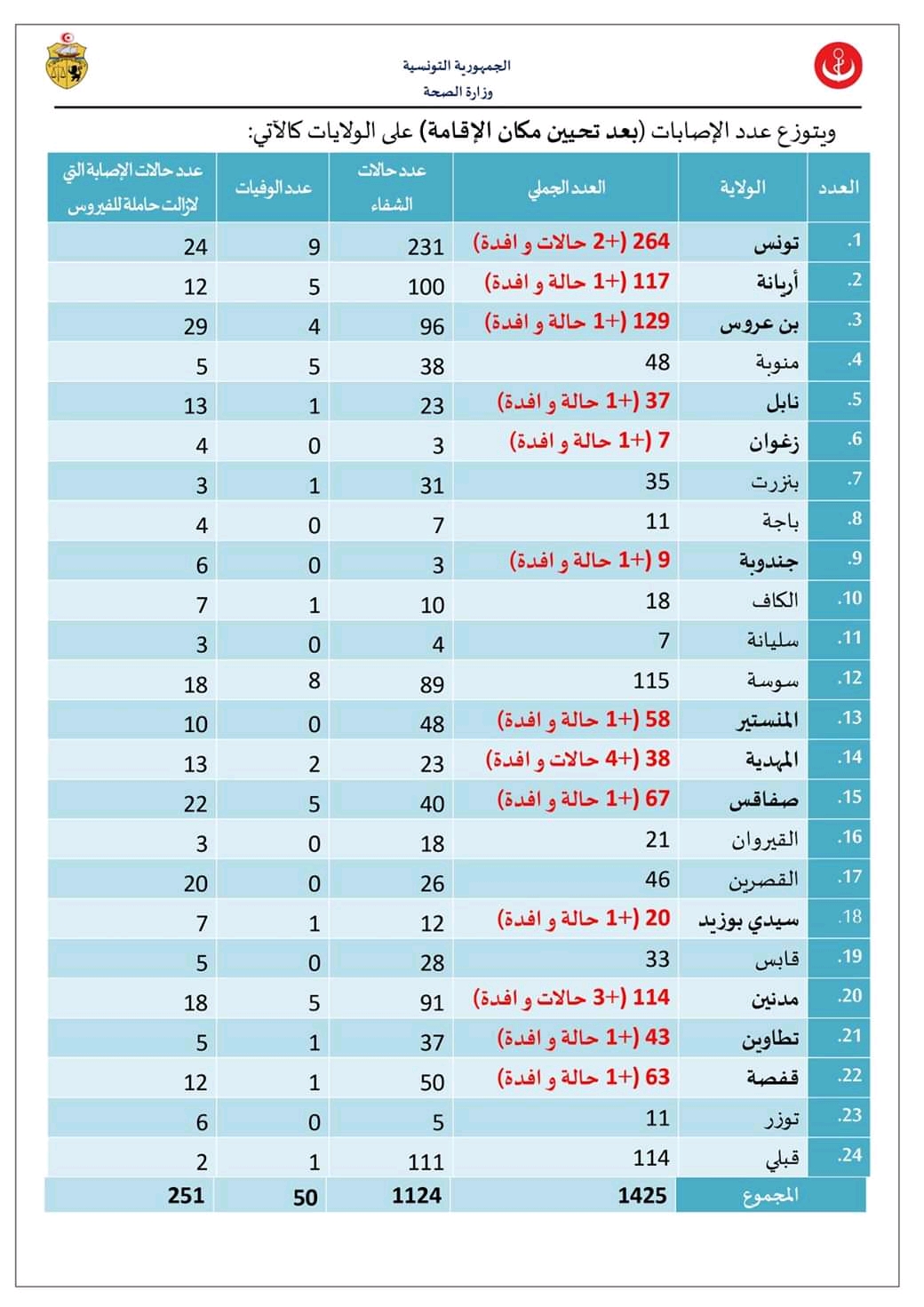 Tunisie-Tribune (Bilan du Covid-19 en Tunisie) – Le ministère de la santé a annoncé que le nombre des cas confirmés de coronavirus est passé à 1425 après la découverte de 19 cas importés de Covid-19 le 23 juillet 2020.
