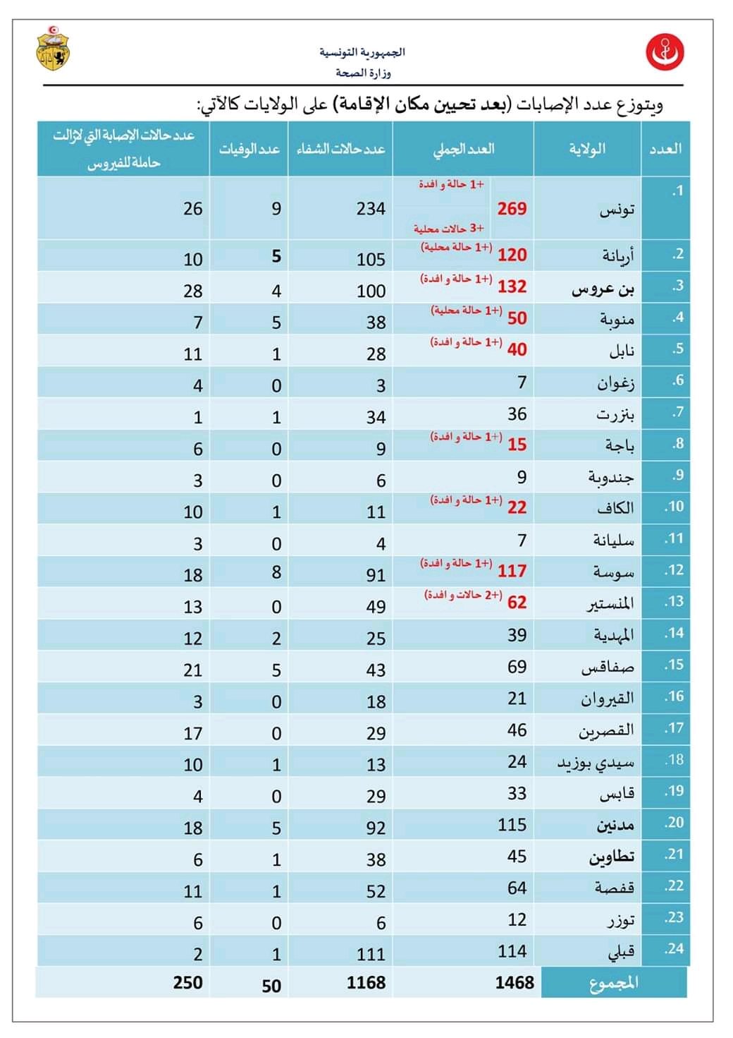 Selon le ministère, le nombre des contaminations se répartissent, ainsi, entre 1168 cas de guérison, 50 décès et 250 cas encore porteurs du virus dont 7 hospitalisés.