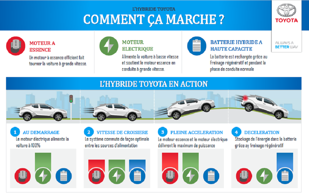 Pas besoin de la brancher, votre Toyota Hybride est totalement autonome. La batterie se recharge toute seule durant les différentes phases de conduite vous permettant d’effectuer 50% de votre temps de trajet en tout électrique. Comment ça marche ?
