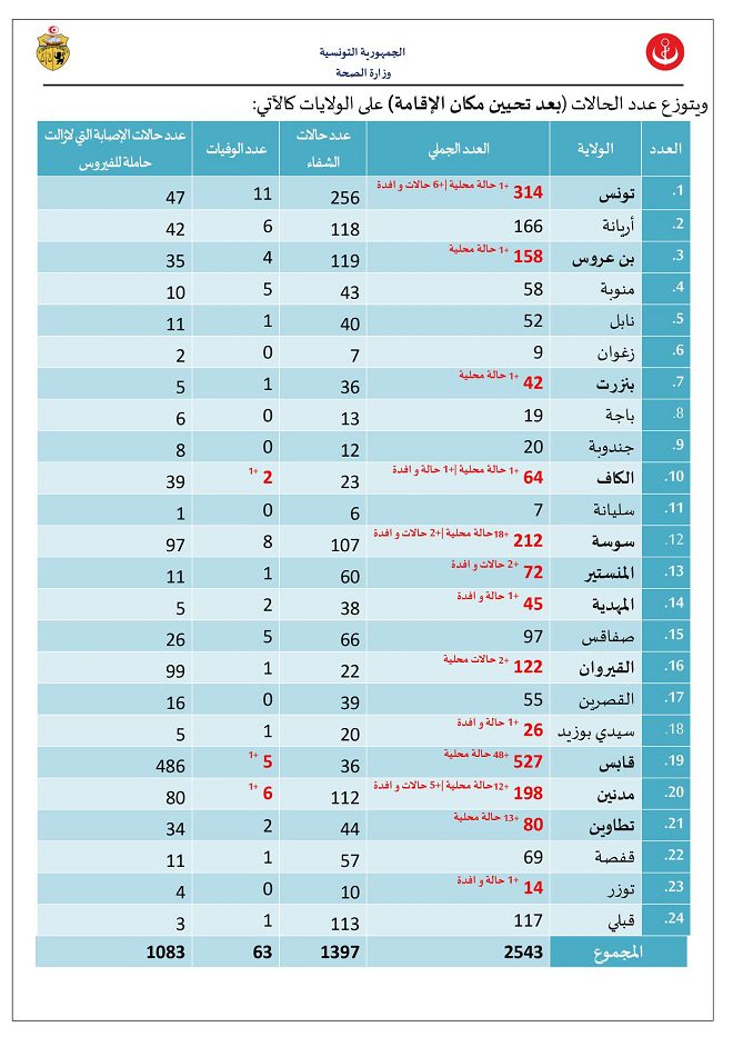 Tunisie-Tribune (Bilan du Covid-19 en Tunisie) – Le ministère de la Santé a annoncé 3 nouveaux décès et 116 nouvelles atteintes au Coronavirus dont 97 locales et 19 importées.