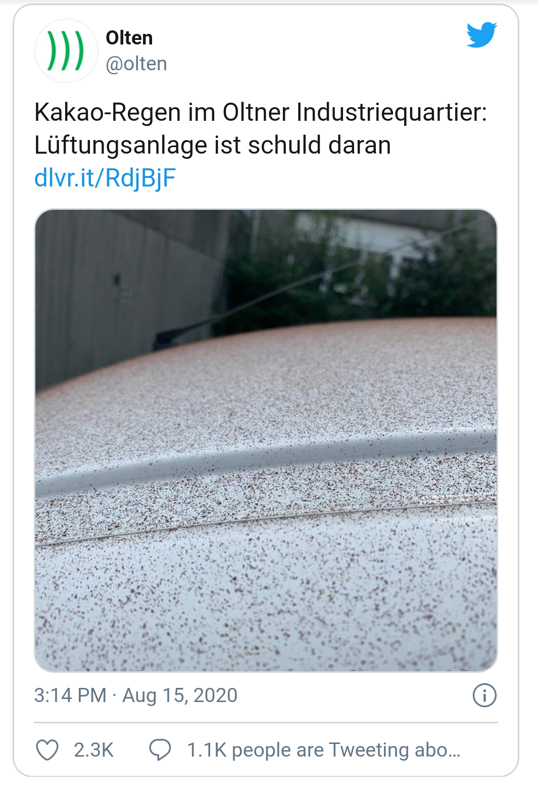 Tunisie-Tribune (pleut du chocolat) – Les habitants de Olten, en Suisse, ont eu la drôle de surprise de voir tomber du ciel des gouttes… de chocolat.